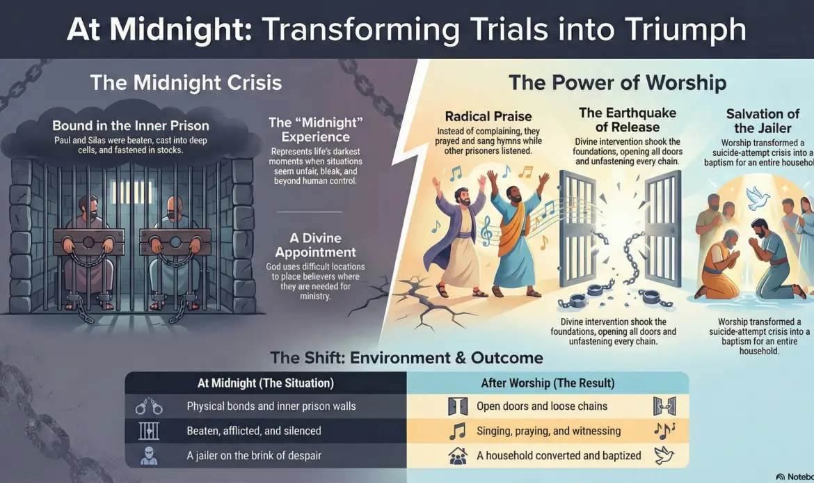We must decide if we will be defined by our problems or by our response to them. As you stand in your own hour of darkness, consider this: Is your current struggle a prison, or is it the stage for the song that will set someone else free? Don’t just survive your midnight—worship through it.