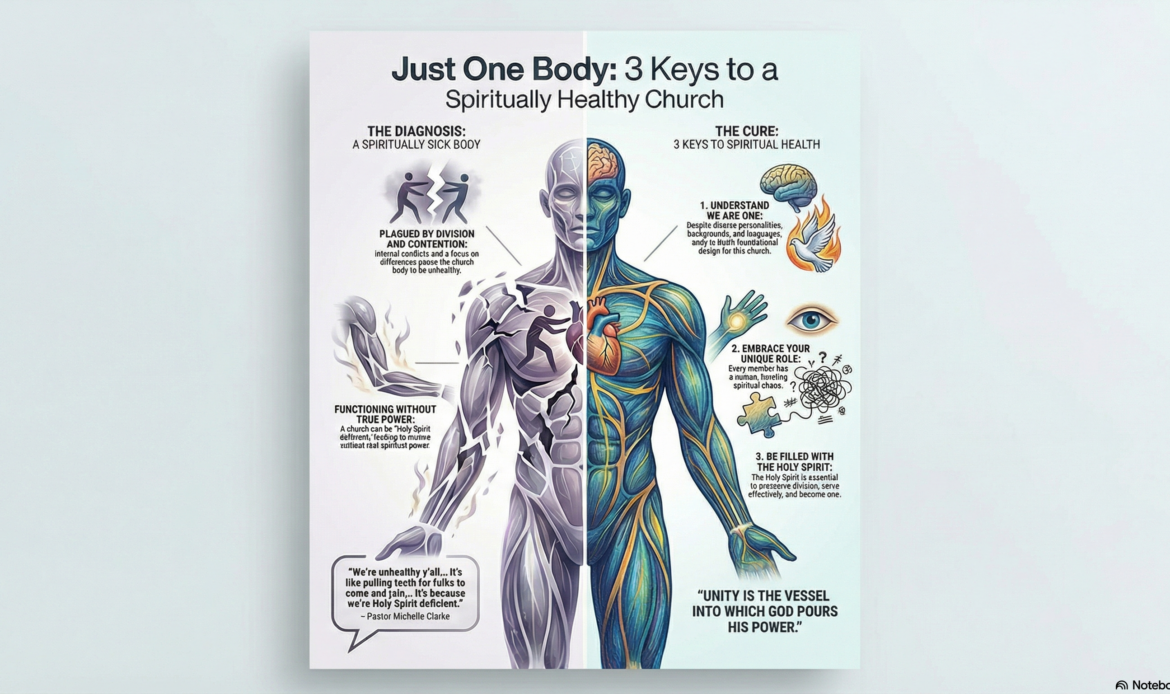 Executive Summary: This sermon utilizes the biological metaphor of the human body, as presented by the Apostle Paul, to diagnose spiritual sickness within the modern church. Pastor Clarke argues that congregational health is contingent upon three factors: acknowledging ontological unity, embracing diverse vocational roles, and receiving the indwelling of the Holy Spirit.