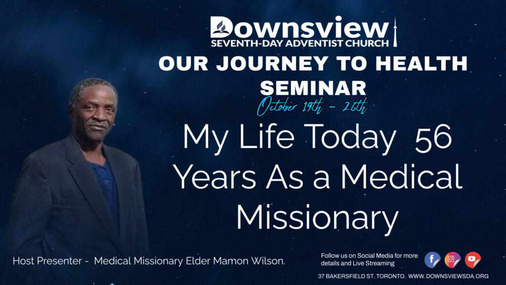 Join us for the first night of the Downsview Seventh-day Adventist Church’s “Our Journey to Health” seminar series! In this inspiring presentation titled “My Life Today – 56 Years As a Medical Missionary,” Elder Mamon Wilson shares his incredible journey dedicating his life to serving others through healthcare.