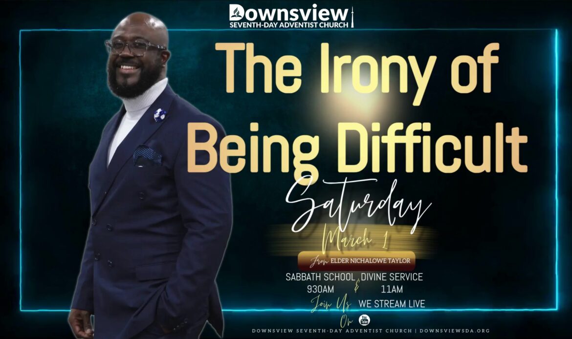 Join us this Sabbath at Downsview Seventh-day Adventist Church for our Divine Service, featuring the sermon ‘The Irony of Being Difficult,’ with our main speaker, Elder Nichalowe Taylor. We’ll delve into 2 Timothy 2:23-26, exploring the wisdom found in scripture. Let’s reflect and grow together in faith.